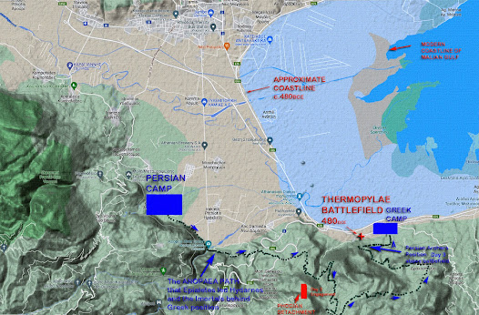 The military action at Thermopylae, at the head of the Malian Gulf, was always intended by Themistocles, the Athenian general, as a combined land and maritime exercise to thwart the Persian advance in 480BCE by the Allied Greeks. On the maritime front the Persians were engaged by the Greek fleet at Artemisium on the north-east tip of Euboea, where the narrow strait into the Malian Gulf, that would bring the Persians behind the Greek forces, was guarded. The Persians had lost about a third of their fleet of 1200 ships to a storm off Magnesia and then because of the Greek naval deployment blocking the access from the east Xerxes dispatched another 200 ships to circumnavigate Euboea to enter the Malian Gulf from the south to attack the Allied Greeks from behind. These ships were also lost to another storm leaving about 600 Persian ships to engage the much smaller Allied Greek Navy. Following news that the Spartans had been beaten – there was a galley standing off shore of the much closer coastline of then to relay the information – the Greek naval forces, which were heavily outnumbered – they lost 100 of their fleet of 271 ships, – withdrew from Artemisium to Salamis where they regrouped and where they would inflict a decisive defeat on the Persian fleet later in the year.